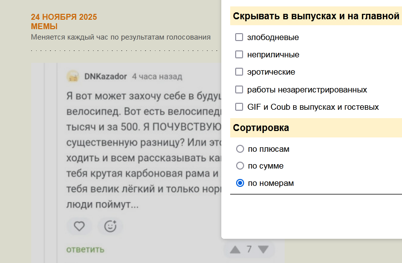 А я всегда сортирую по номерам, поскольку не могу за раз пройти все. И вот что заметил: после возвращения и соответственно обновления страницы (а обновление нужно через каждый час, поскольку в куки этой настройки сортировки видимо нет и она постоянно забывается) вдруг появляются новые мемы, которых не было тут ещё часа два назад. То есть выкладка продолжается и после публикации.